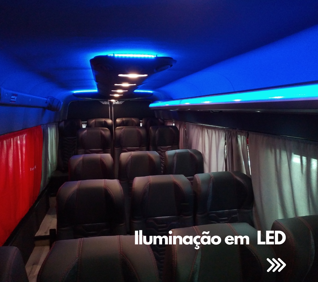 Nossas vans para passageiros contam com iluminação interna individual, permitindo que cada ocupante tenha conforto visual personalizado durante a viagem. Além disso, dispõem de airbag com material ant-bactericida, garantindo maior higiene e proteção no dia a dia.