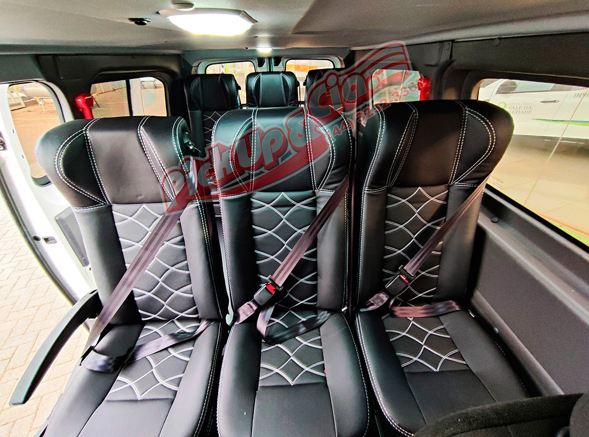 O piso de fibra antiderrapante facilita a limpeza e aumenta a segurança ao embarcar e desembarcar, mesmo em dias de chuva. Já a capa de banco combinando com os assentos dianteiros oferece um visual harmonioso e profissional, reforçando o padrão estético do veículo.